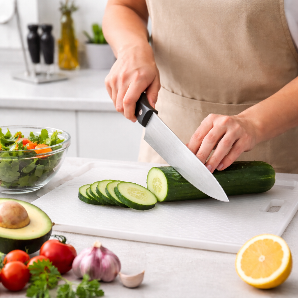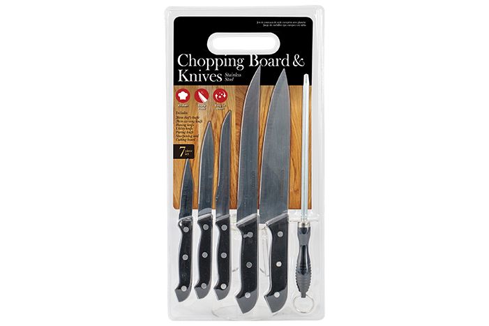 The Knife & Chopping Board 7pc Set includes a 20cm Chef’s Knife, 20cm Carving Knife, Boning Knife, Utility Knife, Paring Knife, Sharpening Steel, and a Cutting Board, giving you the essential tools needed for slicing, carving, trimming, peeling, and general meal preparation. Each knife is made from stainless steel, designed for reliable performance, sharp cutting, and easy maintenance.