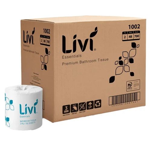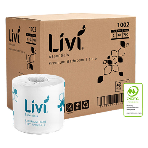 Livi Essentials Toilet Tissue – 2Ply 700Â sheets – delivers a soft and absorbent quality toilet paper at an affordable price. Each toilet paper roll has a lovely emboss for comfort and performance and individual wrapped for fresh presentation in modern facilities. The Livi Essentials 1002Â is available in 48 toilet paper rolls per carton, and is ideal for small to medium sized washrooms.