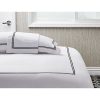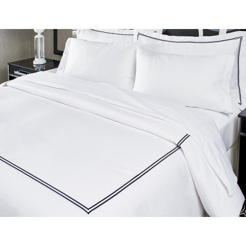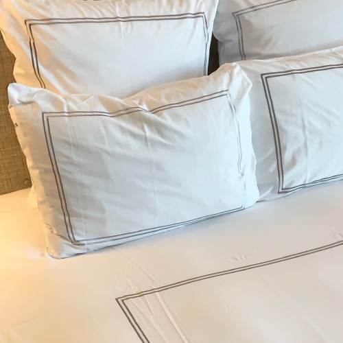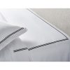 Contains 2 white embroidered pillowcases with charcoal black double stripes.