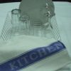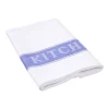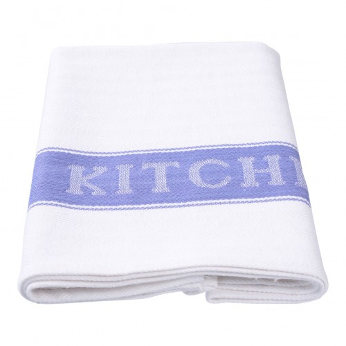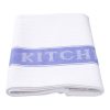 This tea towel has “Kitchen Cloth” printed within a blue stripe that runs down both sides of the tea towel.