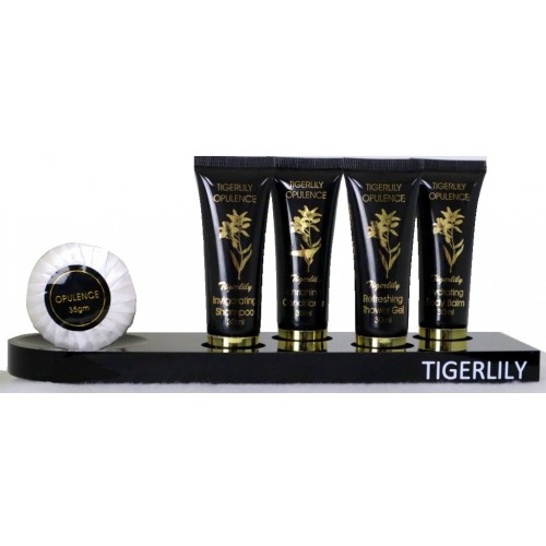 A beautiful gloss black presentation tray for your vanity basin. This tray holds 4 Tigerlily tubes, 1 x 20gm or 35gm soap, and you can also fit a shower cap or sani bag boxed item on there. Small rubber stops on the underside stop the tray from scratching polished surfaces.